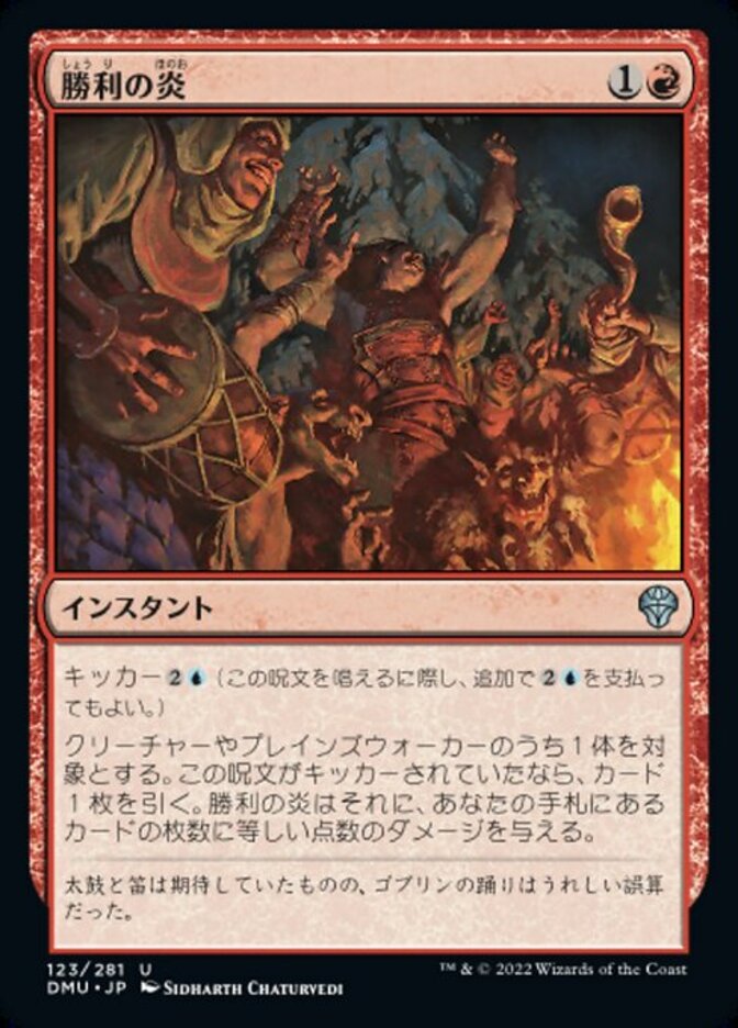 | Rules | Kicker (You may pay an additional as you cast this spell.) If this spell was kicked, draw a card. Fires of Victory deals damage to target creature or planeswalker equal to the number of cards in your hand. |