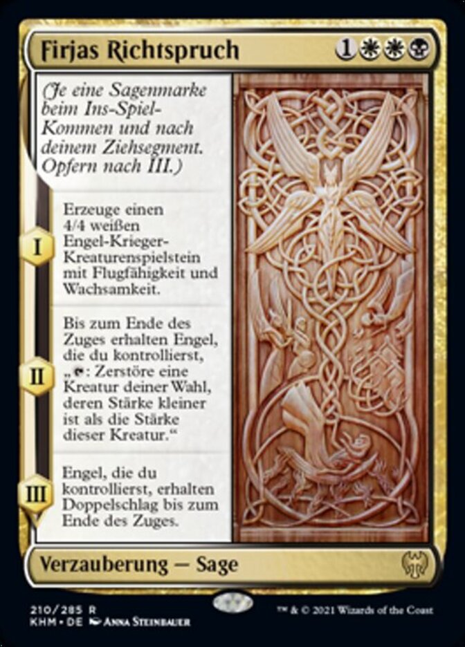 | Rules | (As this Saga enters and after your draw step, add a lore counter. Sacrifice after III.) I — Create a 4/4 white Angel Warrior creature token with flying and vigilance. II — Until end of turn, Angels you control gain ": Destroy target creature with power less than this creature's power." III — Angels you control gain double strike until end of turn. |