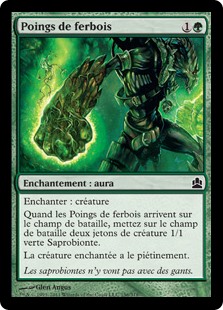 | Rules | Enchant creature When Fists of Ironwood enters the battlefield, create two 1/1 green Saproling creature tokens. Enchanted creature has trample. |