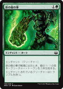 | Rules | Enchant creature When Fists of Ironwood enters the battlefield, create two 1/1 green Saproling creature tokens. Enchanted creature has trample. |