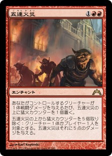 | Rules | Whenever a creature you control deals combat damage, put a blaze counter on Five-Alarm Fire. Remove five blaze counters from Five-Alarm Fire: It deals 5 damage to any target. |