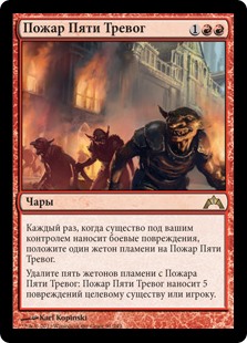 | Rules | Whenever a creature you control deals combat damage, put a blaze counter on Five-Alarm Fire. Remove five blaze counters from Five-Alarm Fire: It deals 5 damage to any target. |