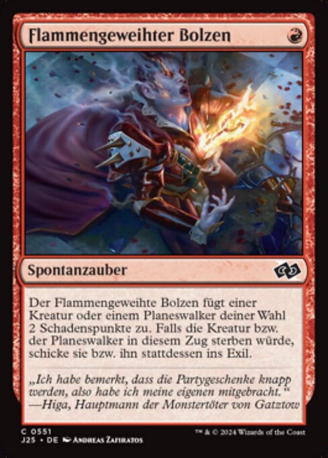 | Rules | Flame-Blessed Bolt deals 2 damage to target creature or planeswalker. If that creature or planeswalker would die this turn, exile it instead. |