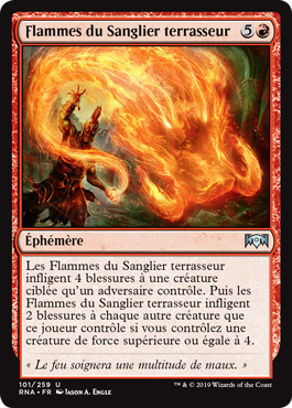 | Rules | Flames of the Raze-Boar deals 4 damage to target creature an opponent controls. Then Flames of the Raze-Boar deals 2 damage to each other creature that player controls if you control a creature with power 4 or greater. |