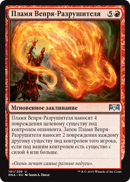 | Rules | Flames of the Raze-Boar deals 4 damage to target creature an opponent controls. Then Flames of the Raze-Boar deals 2 damage to each other creature that player controls if you control a creature with power 4 or greater. |