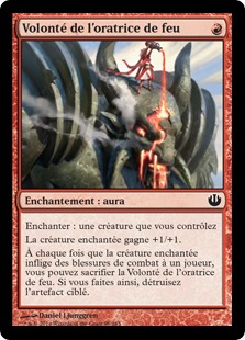 | Rules | Enchant creature you control Enchanted creature gets +1/+1. Whenever enchanted creature deals combat damage to a player, you may sacrifice Flamespeaker's Will. If you do, destroy target artifact. |