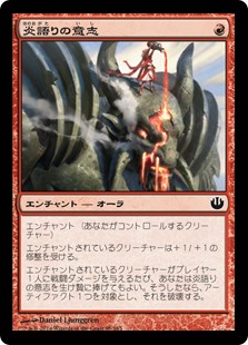 | Rules | Enchant creature you control Enchanted creature gets +1/+1. Whenever enchanted creature deals combat damage to a player, you may sacrifice Flamespeaker's Will. If you do, destroy target artifact. |