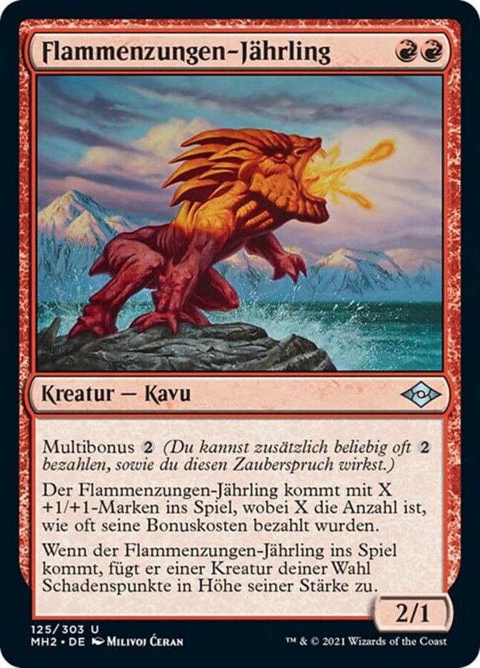 | Rules | Multikicker (You may pay an additional any number of times as you cast this spell.) Flametongue Yearling enters the battlefield with a +1/+1 counter on it for each time it was kicked. When Flametongue Yearling enters the battlefield, it deals damage equal to its power to target creature. |