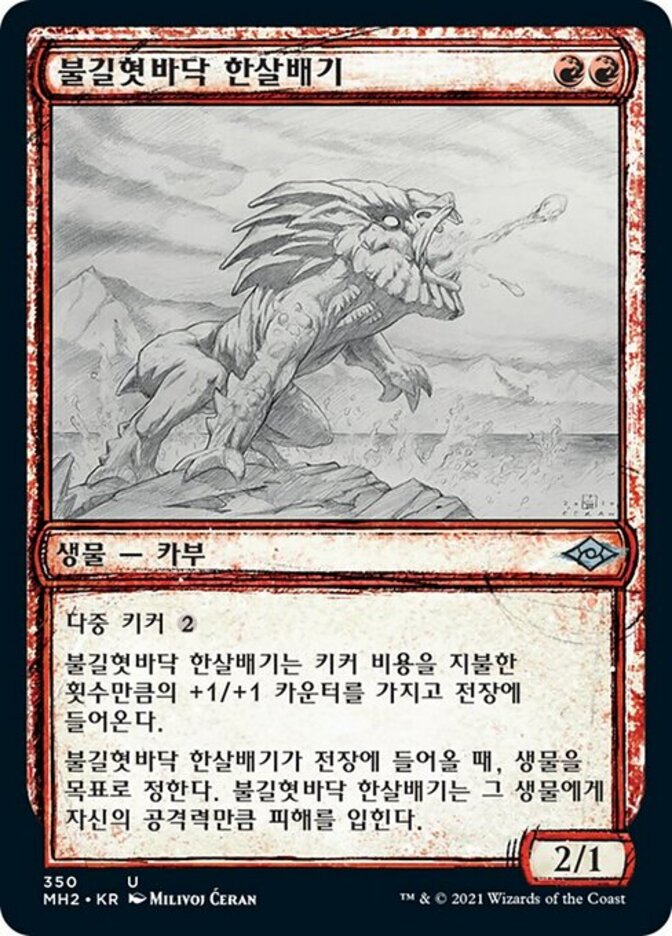 | Rules | Multikicker (You may pay an additional any number of times as you cast this spell.) Flametongue Yearling enters the battlefield with a +1/+1 counter on it for each time it was kicked. When Flametongue Yearling enters the battlefield, it deals damage equal to its power to target creature. |