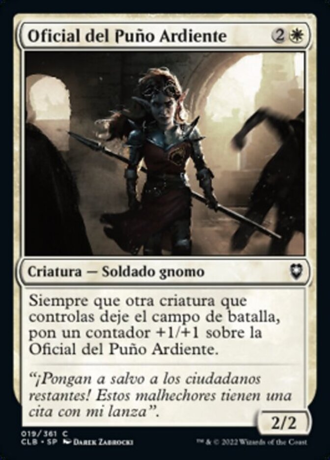 | Rules | Whenever another creature you control leaves the battlefield, put a +1/+1 counter on Flaming Fist Officer. |