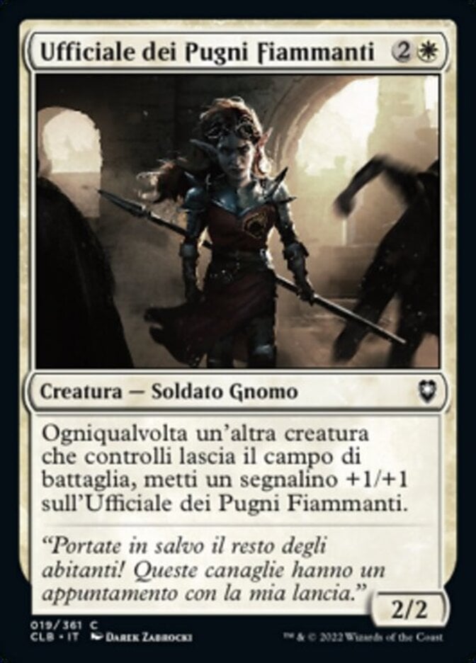 | Rules | Whenever another creature you control leaves the battlefield, put a +1/+1 counter on Flaming Fist Officer. |