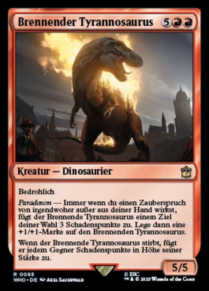 | Rules | Menace Paradox — Whenever you cast a spell from anywhere other than your hand, Flaming Tyrannosaurus deals 3 damage to any target. Then put a +1/+1 counter on Flaming Tyrannosaurus. When Flaming Tyrannosaurus dies, it deals damage equal to its power to each opponent. |