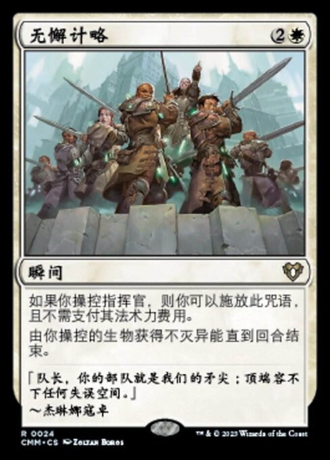 | Rules | If you control a commander, you may cast this spell without paying its mana cost. Creatures you control gain indestructible until end of turn. |