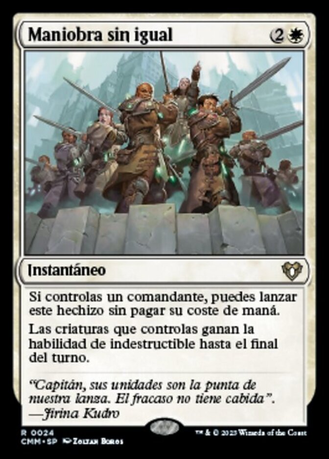| Rules | If you control a commander, you may cast this spell without paying its mana cost. Creatures you control gain indestructible until end of turn. |