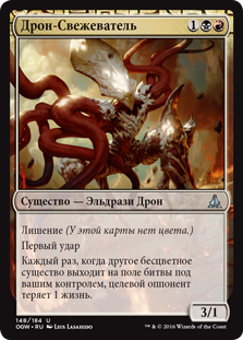 | Rules | Devoid (This card has no color.) First strike Whenever another colorless creature enters the battlefield under your control, target opponent loses 1 life. |