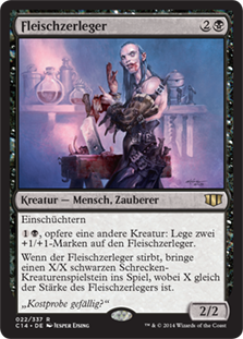 | Rules | Intimidate (This creature can't be blocked except by artifact creatures and/or creatures that share a color with it.) , Sacrifice another creature: Put two +1/+1 counters on Flesh Carver. When Flesh Carver dies, create an X/X black Horror creature token, where X is Flesh Carver's power. |