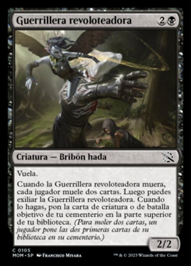 | Rules | Flying When Flitting Guerrilla dies, each player mills two cards. Then you may exile Flitting Guerrilla. When you do, put target creature or battle card from your graveyard on top of your library. (To mill two cards, a player puts the top two cards of their library into their graveyard.) |