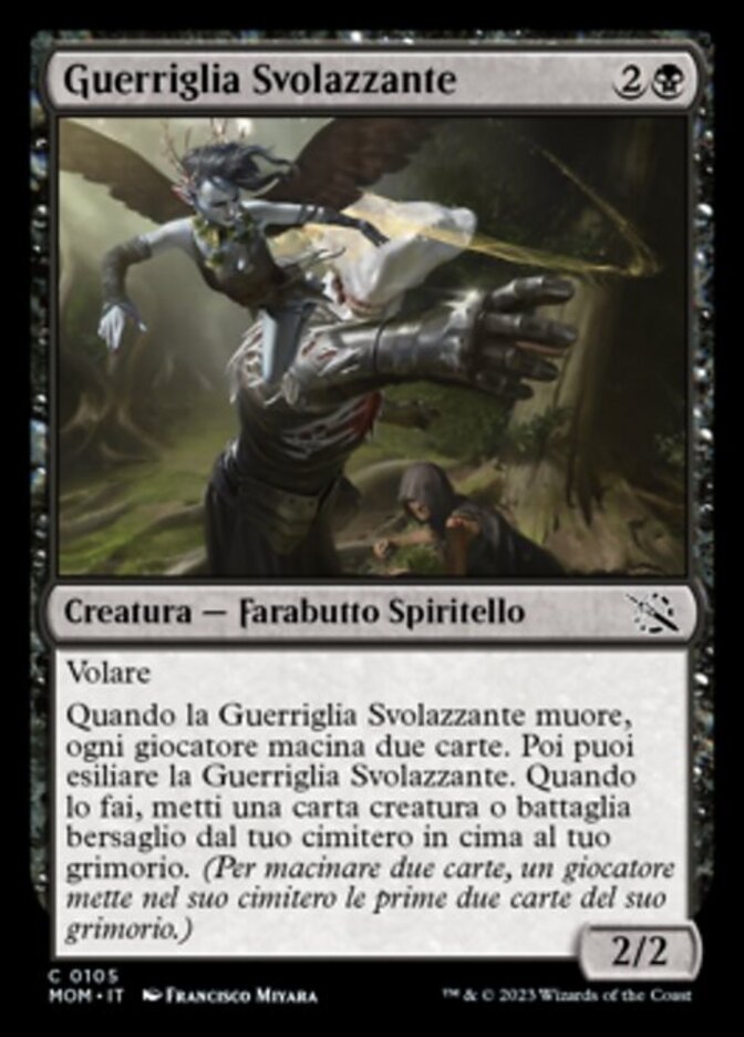 | Rules | Flying When Flitting Guerrilla dies, each player mills two cards. Then you may exile Flitting Guerrilla. When you do, put target creature or battle card from your graveyard on top of your library. (To mill two cards, a player puts the top two cards of their library into their graveyard.) |