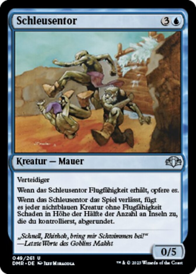 | Rules | Defender (This creature can't attack.) When Floodgate has flying, sacrifice it. When Floodgate leaves the battlefield, it deals damage equal to half the number of Islands you control, rounded down, to each nonblue creature without flying. |
