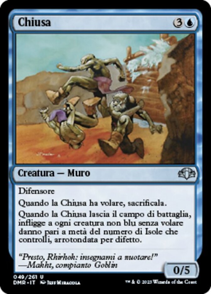 | Rules | Defender (This creature can't attack.) When Floodgate has flying, sacrifice it. When Floodgate leaves the battlefield, it deals damage equal to half the number of Islands you control, rounded down, to each nonblue creature without flying. |