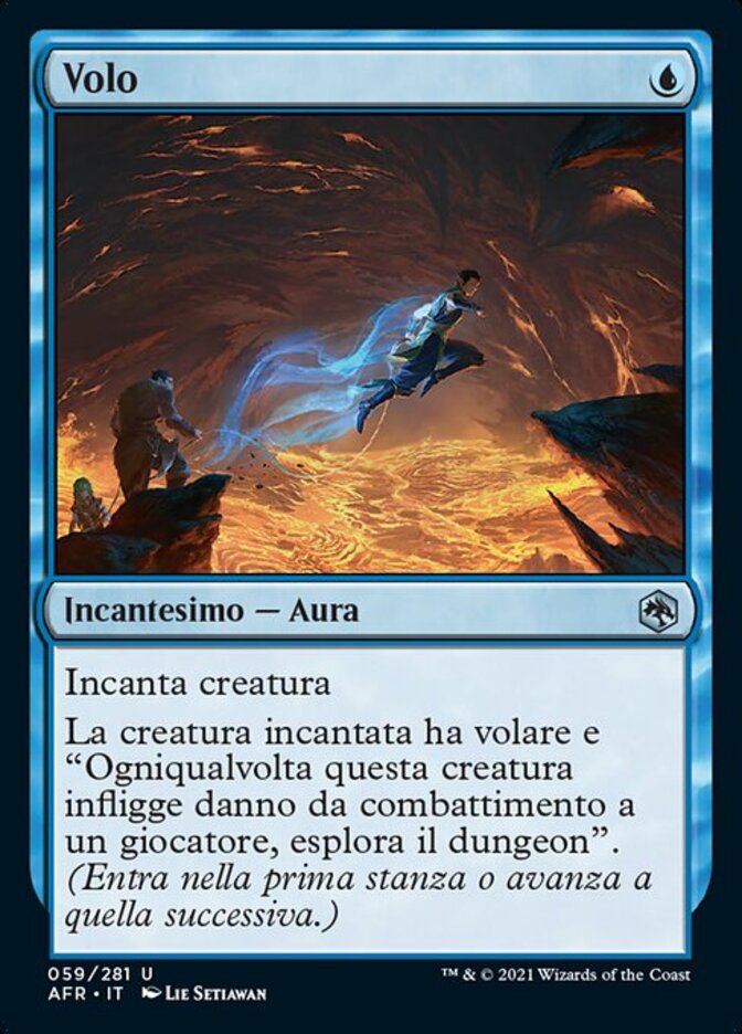 | Rules | Enchant creature Enchanted creature has flying and "Whenever this creature deals combat damage to a player, venture into the dungeon." (Enter the first room or advance to the next room.) |