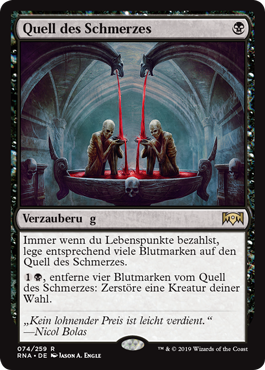 | Rules | Whenever you pay life, put that many blood counters on Font of Agonies. , Remove four blood counters from Font of Agonies: Destroy target creature. |
