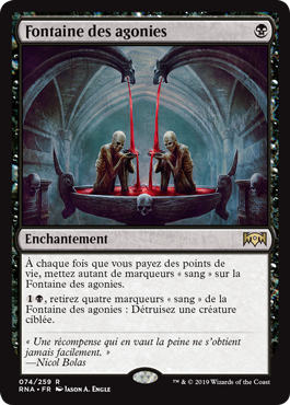 | Rules | Whenever you pay life, put that many blood counters on Font of Agonies. , Remove four blood counters from Font of Agonies: Destroy target creature. |