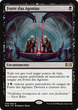 | Rules | Whenever you pay life, put that many blood counters on Font of Agonies. , Remove four blood counters from Font of Agonies: Destroy target creature. |