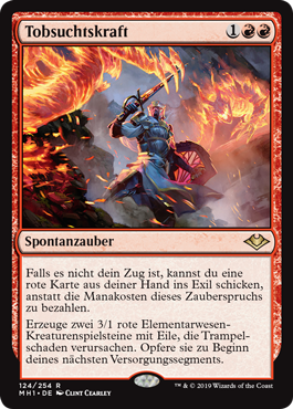 | Rules | If it's not your turn, you may exile a red card from your hand rather than pay this spell's mana cost. Create two 3/1 red Elemental creature tokens with trample and haste. Sacrifice those tokens at the beginning of your next upkeep. |