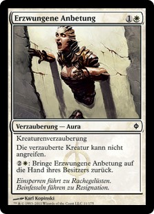 | Rules | Enchant creature Enchanted creature can't attack. : Return Forced Worship to its owner's hand. |