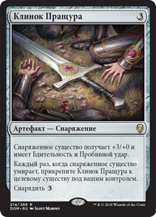 | Rules | Equipped creature gets +3/+0 and has vigilance and trample. Whenever equipped creature dies, attach Forebear's Blade to target creature you control. Equip |