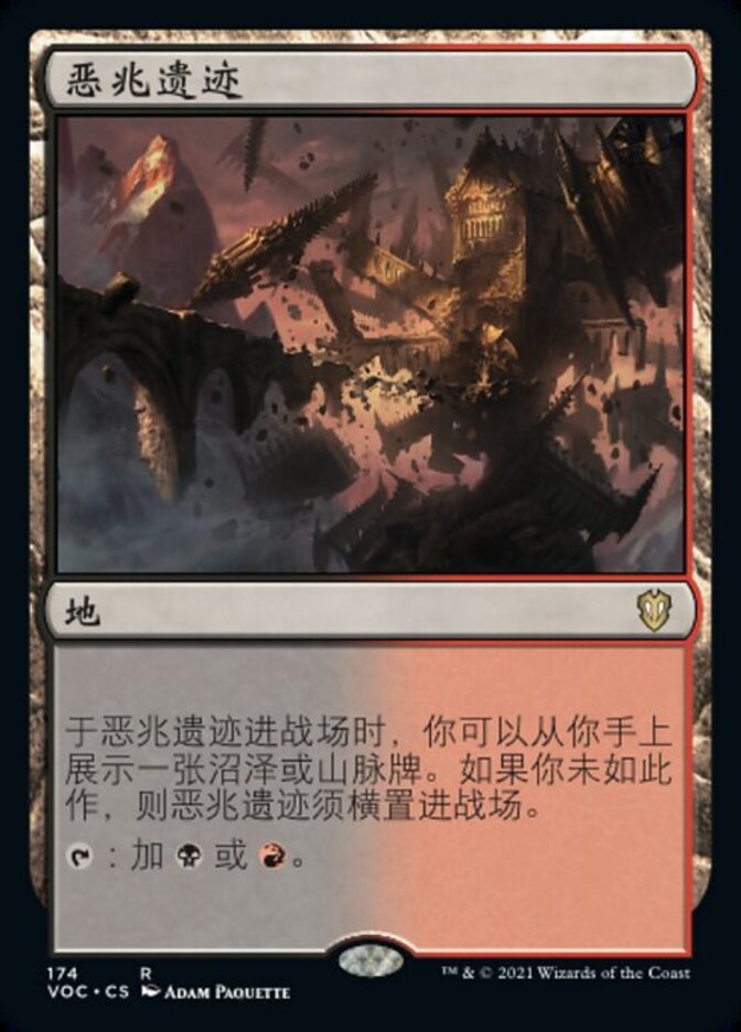 | Rules | As Foreboding Ruins enters the battlefield, you may reveal a Swamp or Mountain card from your hand. If you don't, Foreboding Ruins enters the battlefield tapped. : Add or . |