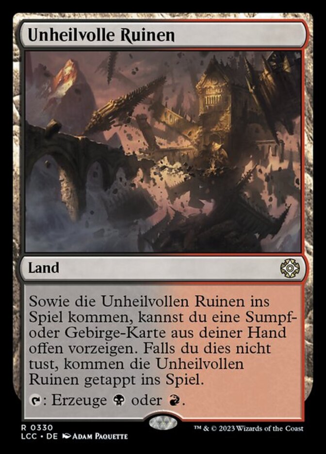 | Rules | As Foreboding Ruins enters the battlefield, you may reveal a Swamp or Mountain card from your hand. If you don't, Foreboding Ruins enters the battlefield tapped. : Add or . |