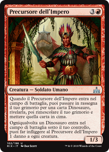 | Rules | When Forerunner of the Empire enters the battlefield, you may search your library for a Dinosaur card, reveal it, then shuffle and put that card on top. Whenever a Dinosaur enters the battlefield under your control, you may have Forerunner of the Empire deal 1 damage to each creature. |