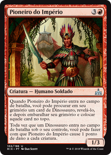 | Rules | When Forerunner of the Empire enters the battlefield, you may search your library for a Dinosaur card, reveal it, then shuffle and put that card on top. Whenever a Dinosaur enters the battlefield under your control, you may have Forerunner of the Empire deal 1 damage to each creature. |