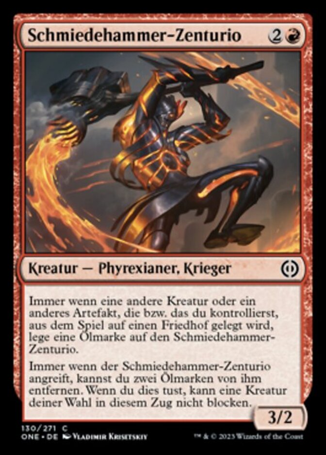 Rules Whenever another creature or artifact you control is put into a graveyard from the battlefield, put an oil counter on Forgehammer Centurion.
