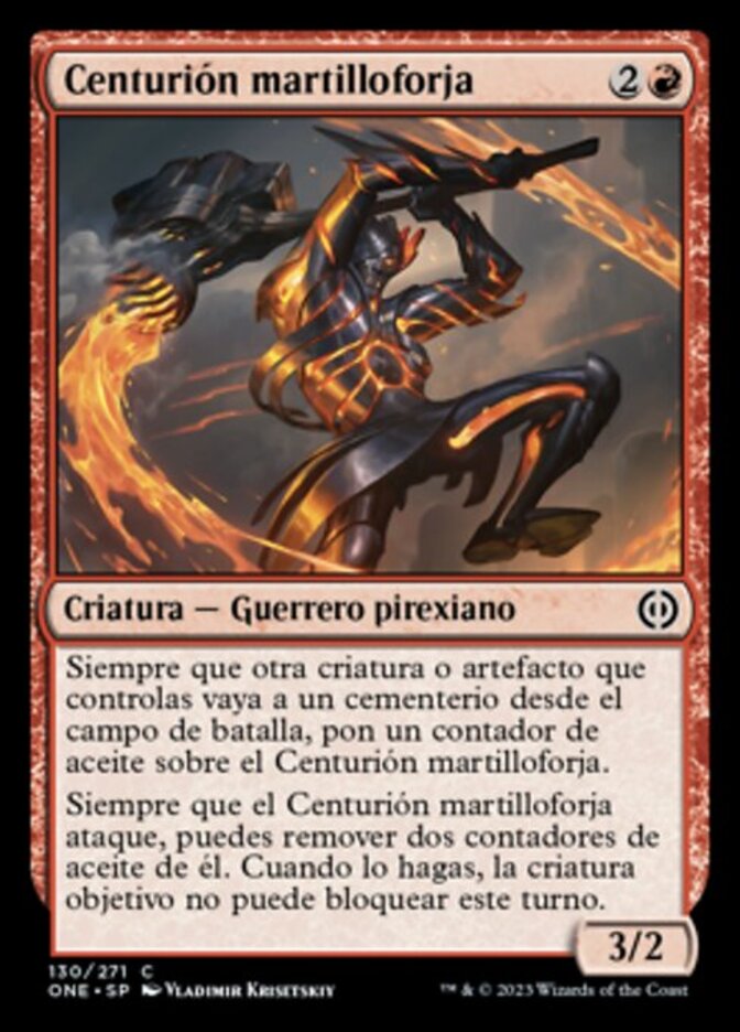 | Rules | Whenever another creature or artifact you control is put into a graveyard from the battlefield, put an oil counter on Forgehammer Centurion. Whenever Forgehammer Centurion attacks, you may remove two oil counters from it. When you do, target creature can't block this turn. |