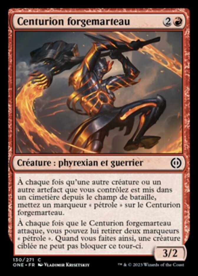| Rules | Whenever another creature or artifact you control is put into a graveyard from the battlefield, put an oil counter on Forgehammer Centurion. Whenever Forgehammer Centurion attacks, you may remove two oil counters from it. When you do, target creature can't block this turn. |
