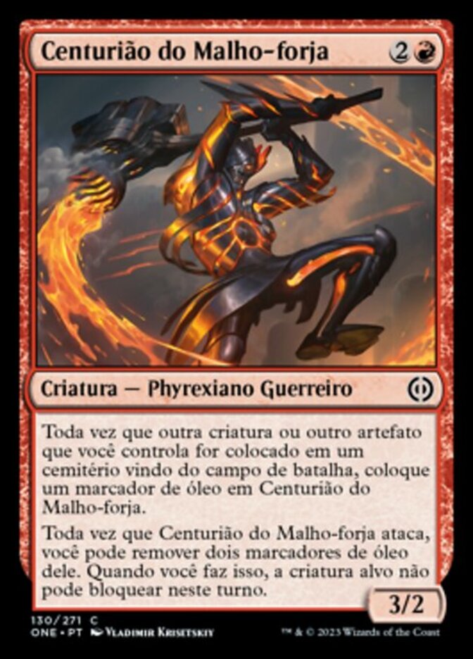 | Rules | Whenever another creature or artifact you control is put into a graveyard from the battlefield, put an oil counter on Forgehammer Centurion. Whenever Forgehammer Centurion attacks, you may remove two oil counters from it. When you do, target creature can't block this turn. |