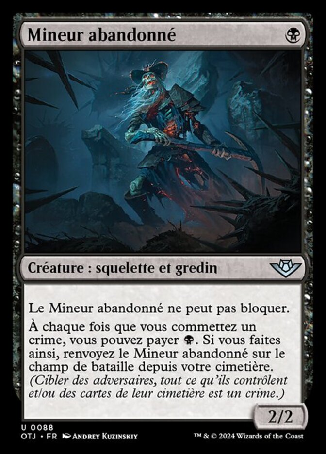 | Rules | Forsaken Miner can't block. Whenever you commit a crime, you may pay . If you do, return Forsaken Miner from your graveyard to the battlefield. (Targeting opponents, anything they control, and/or cards in their graveyards is a crime.) |