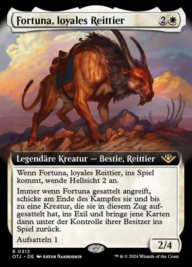 | Rules | When Fortune, Loyal Steed enters the battlefield, scry 2. Whenever Fortune attacks while saddled, at end of combat, exile it and up to one creature that saddled it this turn, then return those cards to the battlefield under their owner's control. Saddle 1 |