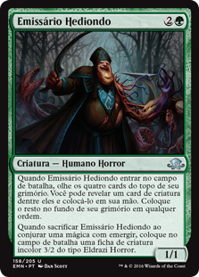 | Rules | When Foul Emissary enters the battlefield, look at the top four cards of your library. You may reveal a creature card from among them and put it into your hand. Put the rest on the bottom of your library in any order. When you sacrifice Foul Emissary while casting a spell with emerge, create a 3/2 colorless Eldrazi Horror creature token. |
