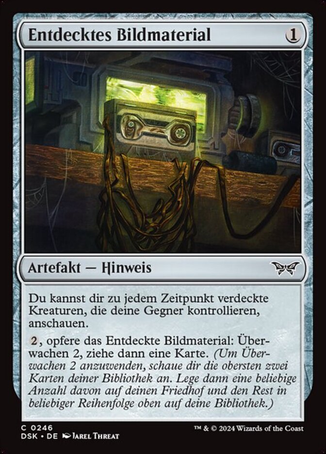| Rules | You may look at face-down creatures your opponents control any time. , Sacrifice Found Footage: Surveil 2, then draw a card. (To surveil 2, look at the top two cards of your library, then put any number of them into your graveyard and the rest on top of your library in any order.) |