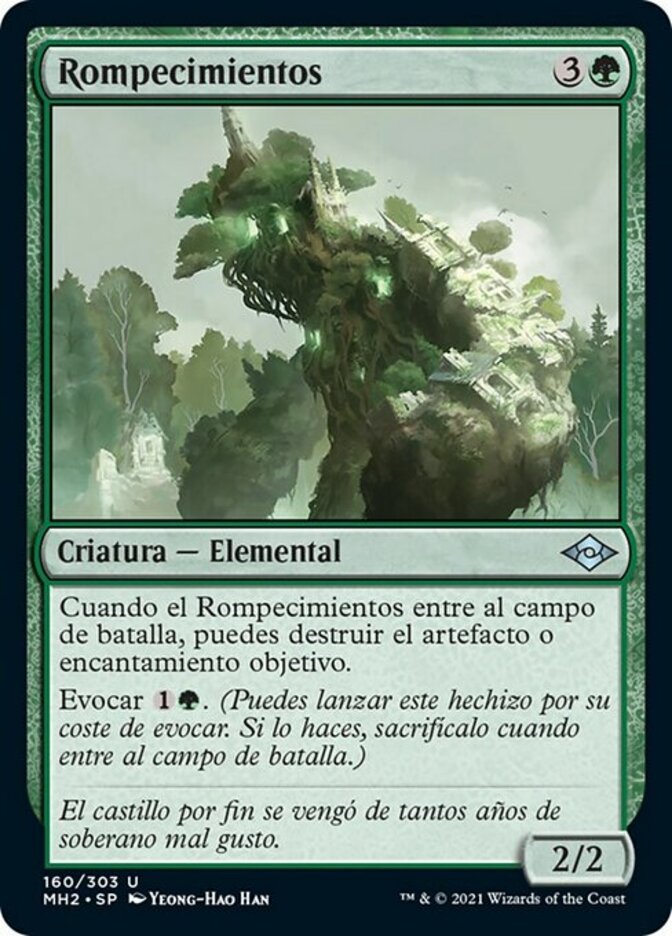 | Rules | When Foundation Breaker enters the battlefield, you may destroy target artifact or enchantment. Evoke (You may cast this spell for its evoke cost. If you do, it's sacrificed when it enters the battlefield.) |