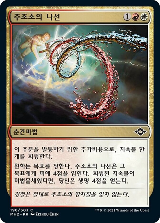 | Rules | As an additional cost to cast this spell, sacrifice a permanent. Foundry Helix deals 4 damage to any target. If the sacrificed permanent was an artifact, you gain 4 life. |