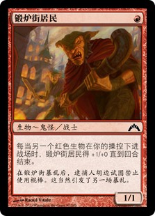 | Rules | Whenever another red creature enters the battlefield under your control, Foundry Street Denizen gets +1/+0 until end of turn. |