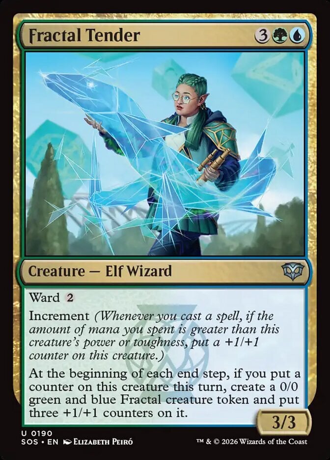 | Rules | Ward Increment (Whenever you cast a spell, if the amount of mana you spent is greater than this creature's power or toughness, put a +1/+1 counter on this creature.) At the beginning of each end step, if you put a counter on this creature this turn, create a 0/0 green and blue Fractal creature token and put three +1/+1 counters on it. |