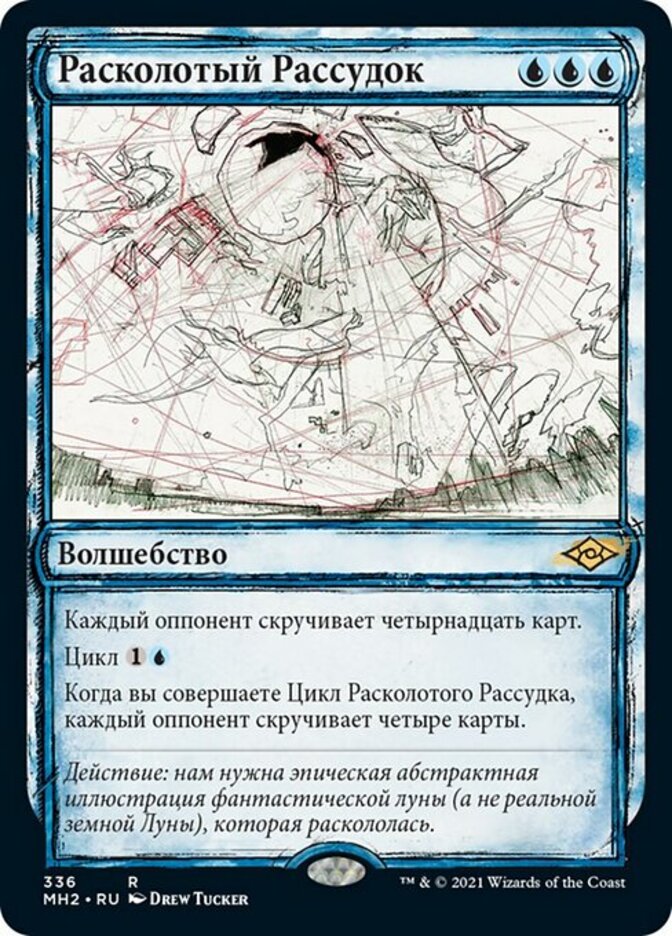 | Rules | Each opponent mills fourteen cards. Cycling (, Discard this card: Draw a card.) When you cycle Fractured Sanity, each opponent mills four cards. |