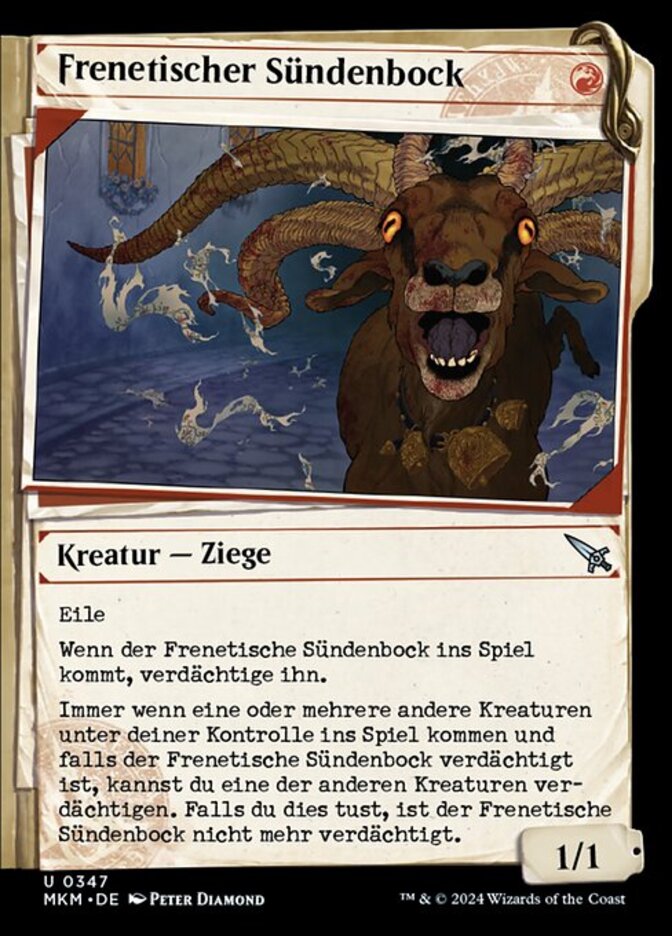 | Rules | Haste When Frantic Scapegoat enters the battlefield, suspect it. (It has menace and can't block.) Whenever one or more other creatures enter the battlefield under your control, if Frantic Scapegoat is suspected, you may suspect one of the other creatures. If you do, Frantic Scapegoat is no longer suspected. |