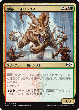 | Rules | Riot (This creature enters the battlefield with your choice of a +1/+1 counter or haste.) Trample : Frenzied Arynx gets +3/+0 until end of turn. |